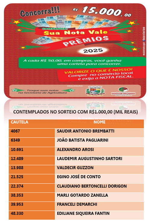 Na sexta-feira, dia 05 de dezembro, durante as comemorações alusivas aos 30 anos de emancipação político-administrativa de Doutor Ricardo, foi realizado o sorteio final da Campanha $ua Nota Vale Prêmio$ - dezembro/2025, que contemplou 10 (dez) ganhadores com R$1.000,00 (mil reais) cada. Foram 48.477 cautelas distribuídas com a troca de notas fiscais, e além da premiação final de dezembro, também foram sorteados dois prêmios de R$300,00 (trezentos reais) de abril a novembro, ainda em novembro, foi sorteado um prêmio extra de R$200,00 (duzentos reais), totalizando R$15.000,00 (quinze mil reais), distribuídos aos premiados com esta ação, que tem por finalidade premiar os cidadãos Ricardenses, que compram em nosso município ou contratam prestadores de serviços.
