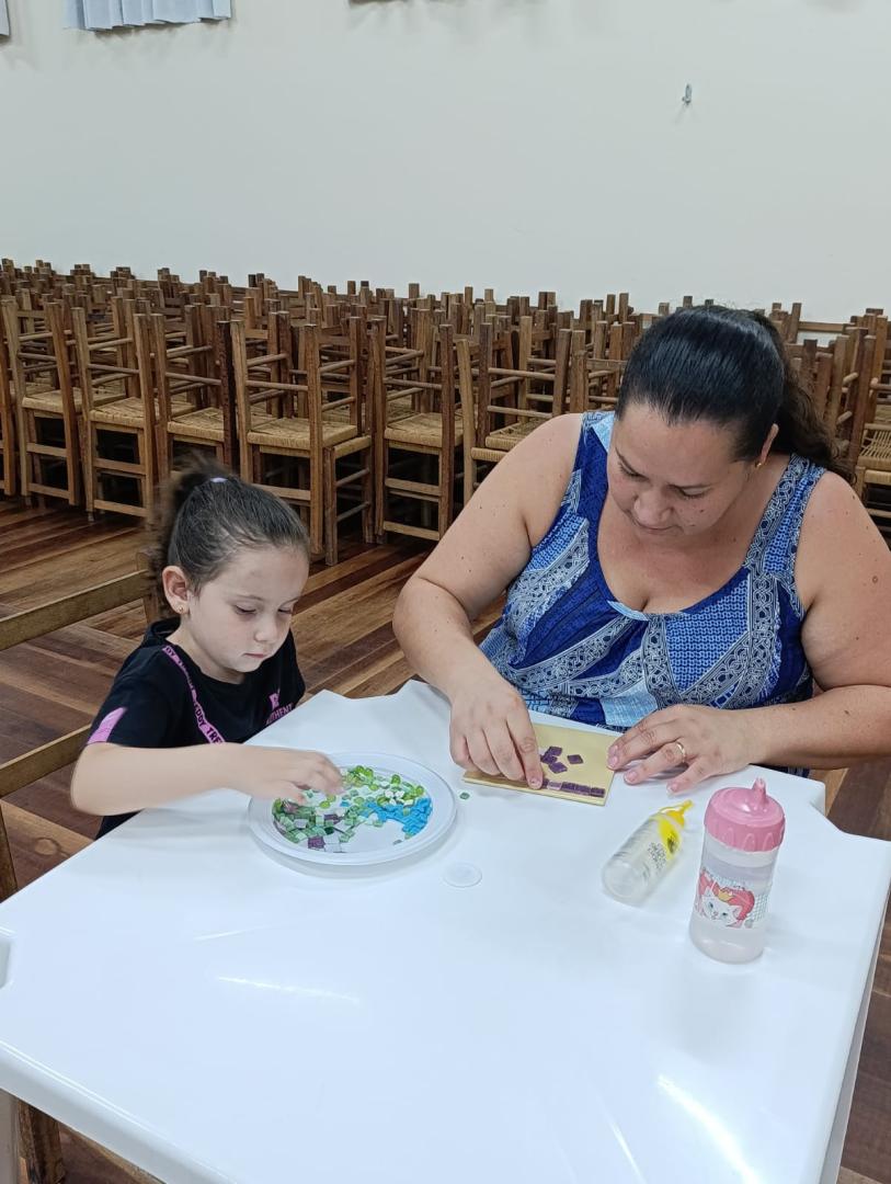 Durante o encontro, foi realizada a atividade “Ladrilho do Amor”, que simboliza o carinho, o cuidado e os laços que fazem a família florescer, reforçando a importância do afeto e da convivência no desenvolvimento das crianças.