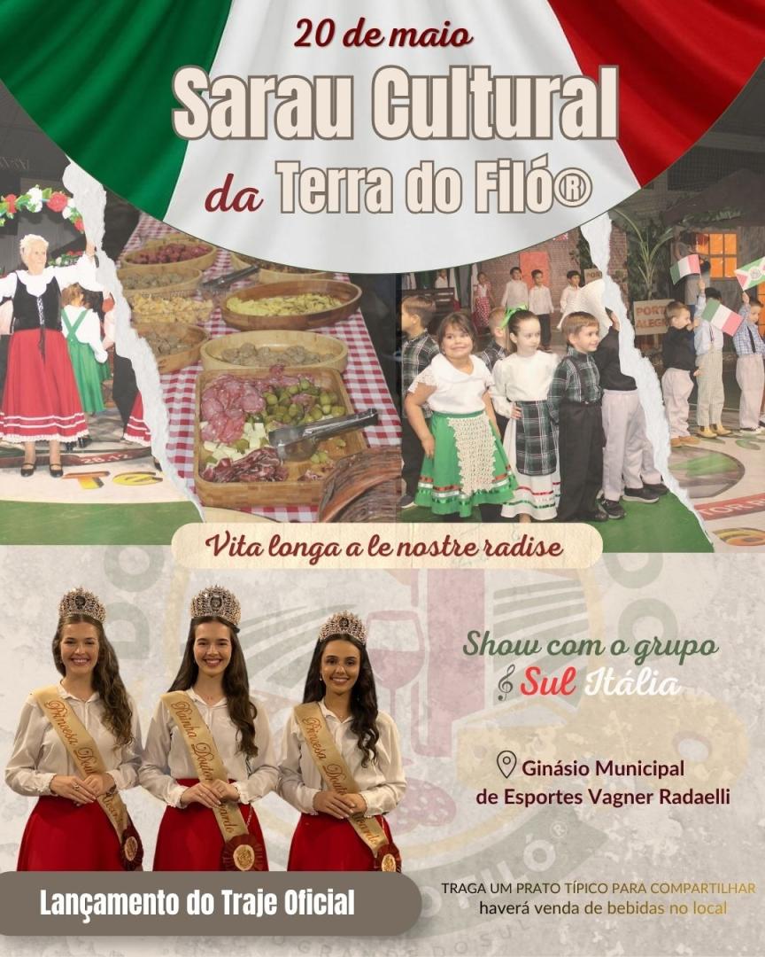 Já no dia 20 de maio, o Ginásio Municipal de Esportes será palco do Sarau Cultural da Terra do Filó® – Vita longa a le nostre radise. O evento destacará a riqueza cultural e artística da colonização italiana, com apresentações especiais dos grupos do município e do grupo Sul Itália. Outro destaque da noite é o lançamento dos trajes da Corte de Soberanas.