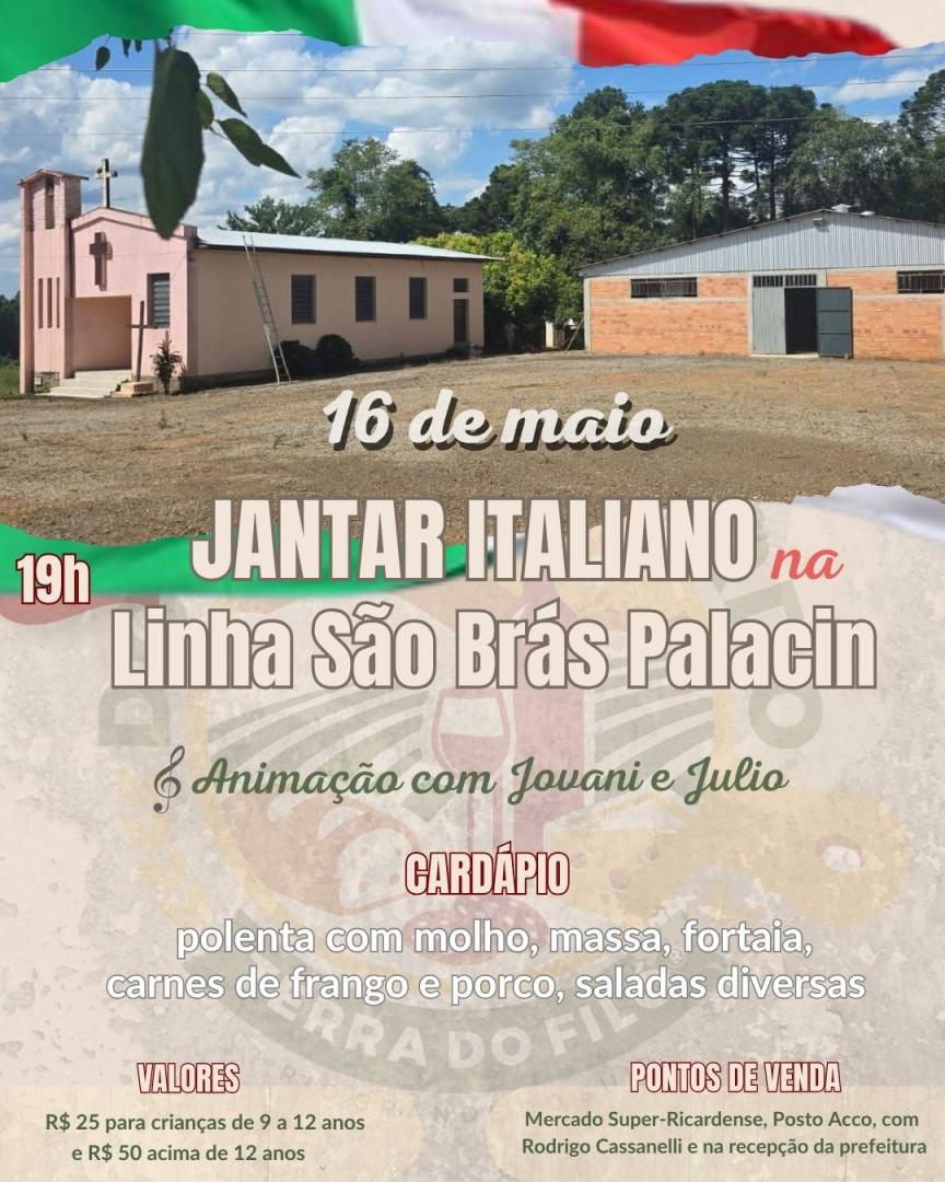 No dia 16 de maio, a comunidade da Linha São Brás/Palacin recebe o Jantar Italiano, oferecendo ao público um cardápio repleto de sabores tradicionais, como polenta, massa, fortaia, carnes e salada. A programação contará ainda com baile animado pela dupla Jovani e Julio.